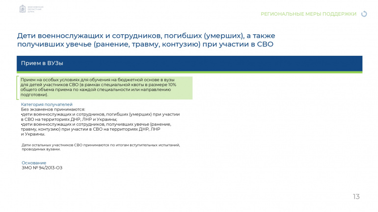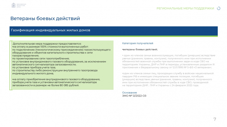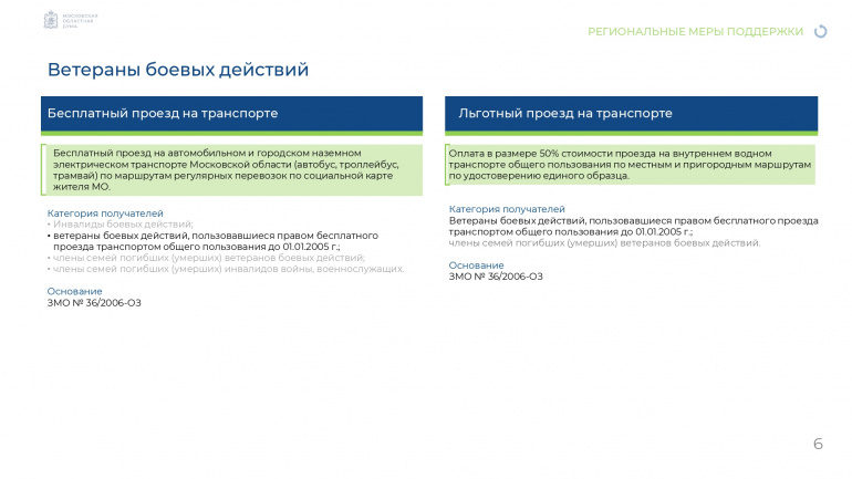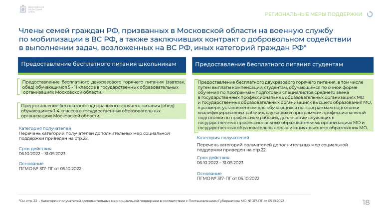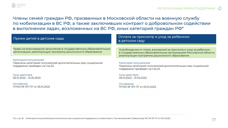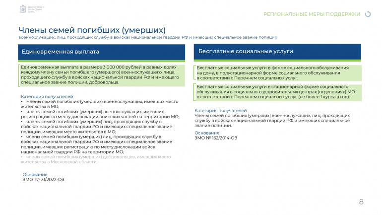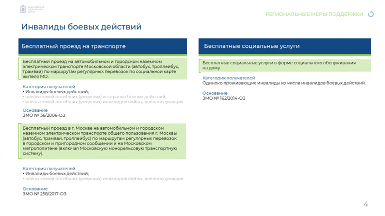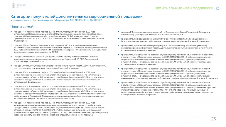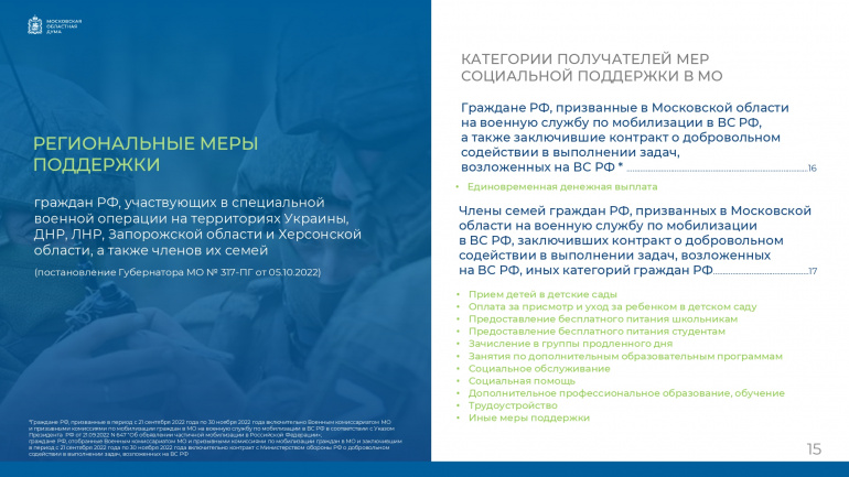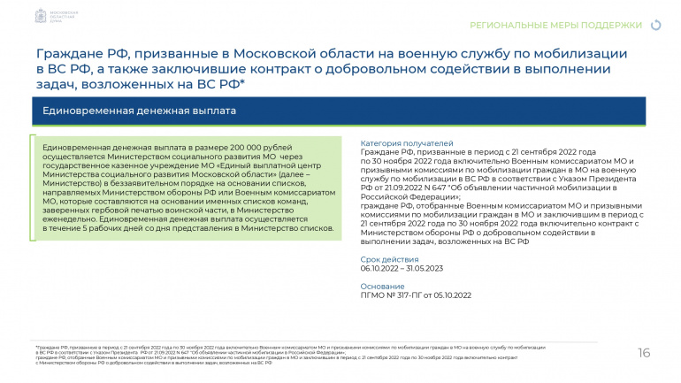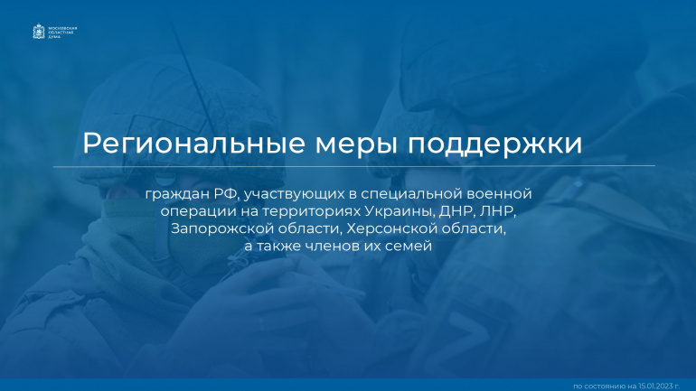 Для участников специальной военной операции на территориях Украины, ДНР, ЛНР, Запорожской и Херсонской областей, а также членов их семей в Московской области действуют различные меры поддержки. В их числе бесплатный проезд на транспорте, газификация индивидуальных жилых домов, бесплатные социальные услуги, единовременные выплаты и так далее. Мособлдума опубликовала список мер поддержки в виде удобных карточек.