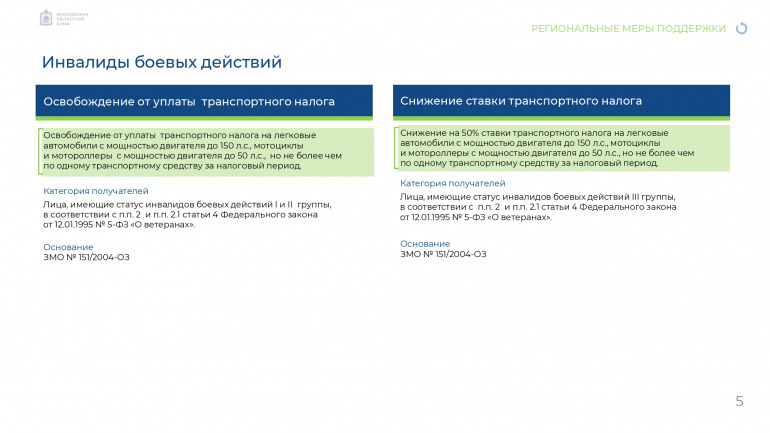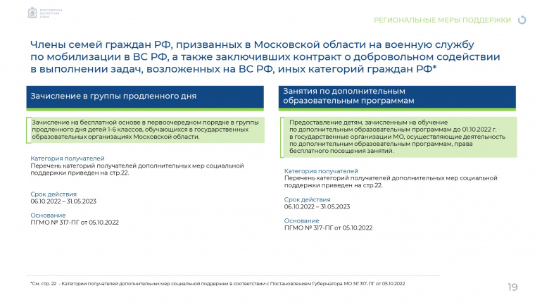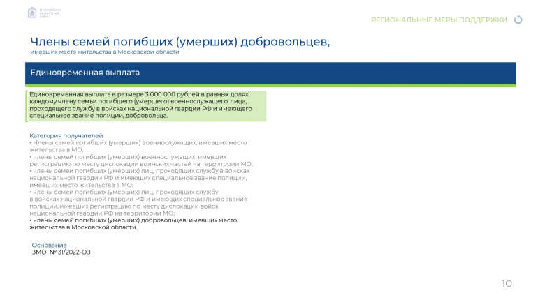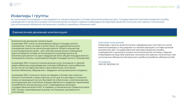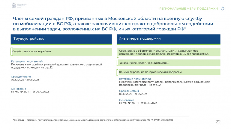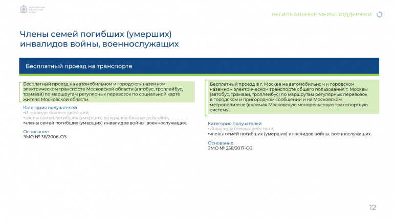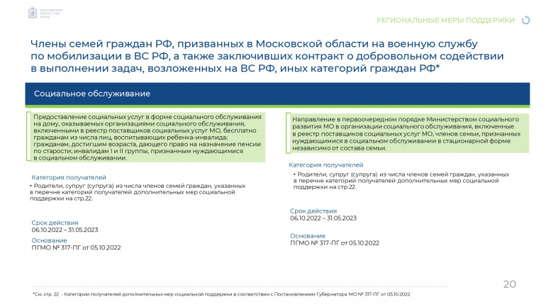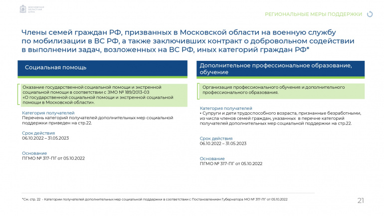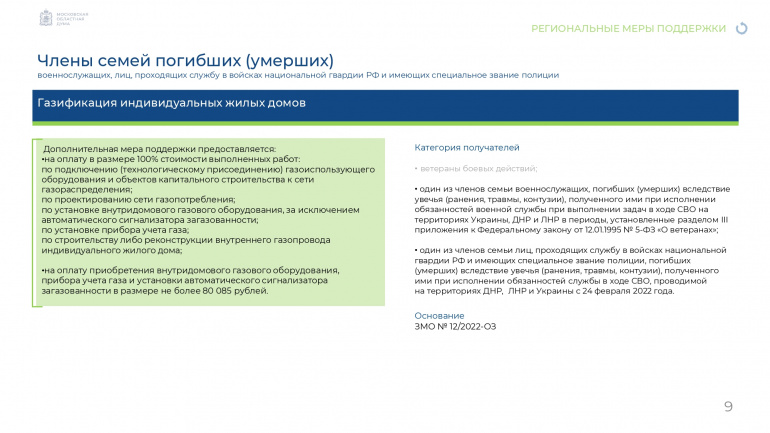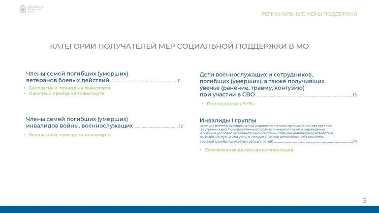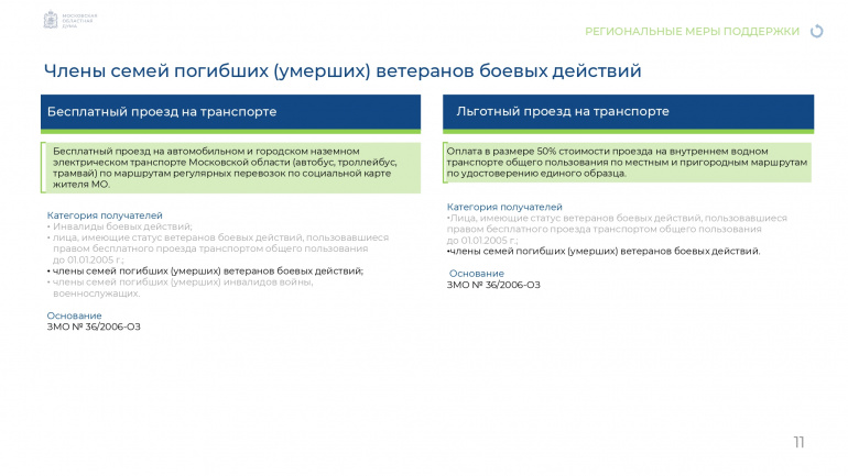 Для участников специальной военной операции на территориях Украины, ДНР, ЛНР, Запорожской и Херсонской областей, а также членов их семей в Московской области действуют различные меры поддержки. В их числе бесплатный проезд на транспорте, газификация индивидуальных жилых домов, бесплатные социальные услуги, единовременные выплаты и так далее. Мособлдума опубликовала список мер поддержки в виде удобных карточек.