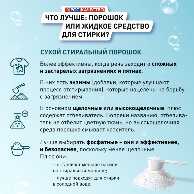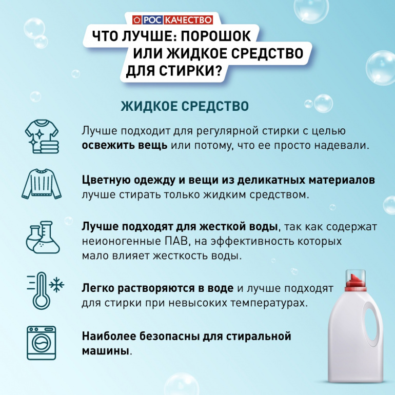 Как средство на каждый день лучше использовать жидкость, советуют в Роскачестве. Она лучше всего подходит для регулярной стирки, которая призвана просто освежить вещи. Кроме того, жидкое средство смягчает жёсткую воду и наиболее безопасно для стиральной машины.