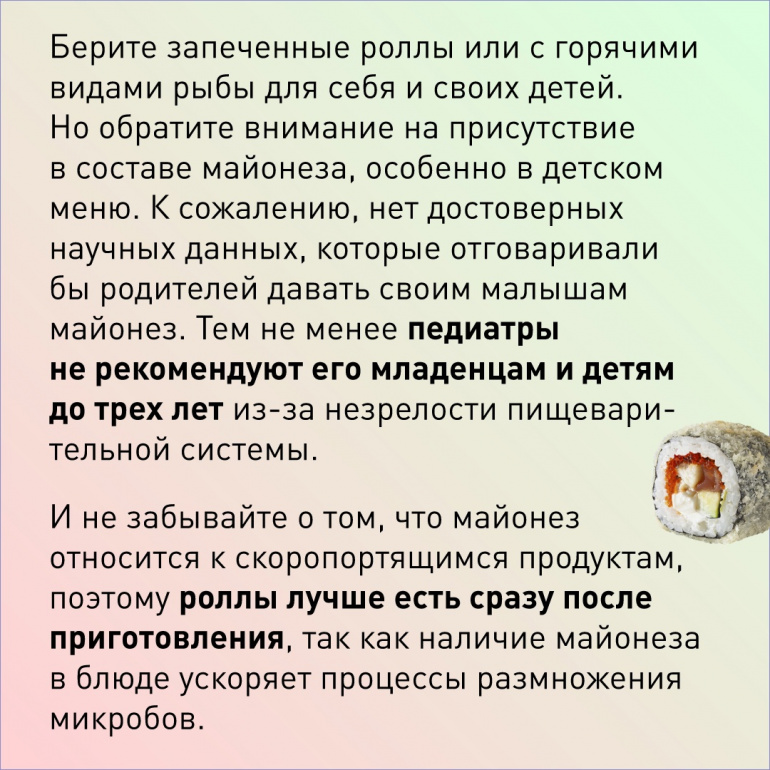 Но даже запечёнными роллами не следует кормить совсем маленьких ребятишек до трёх лет — им противопоказан майонез, который содержится во многих из этих блюд.