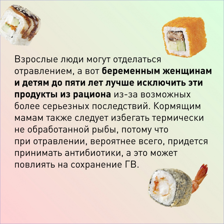 Поскольку рыба термически не обработана, следует употреблять её с осторожностью. Роллов лучше избегать беременным и кормящим мамам, ими не стоит кормить детей до 5 лет. Если вы в «группе риска», но роллов очень хочется, тогда можно заказать запечённый продукт.