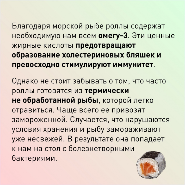 По мнению специалиста, главное преимущество роллов заключается в том, что их, как правило, готовят на основе жирной красной рыбы, а это источник омега-3 кислот и витамина В. Они улучшают иммунитет и предотвращают появление тромбов и склероза.
