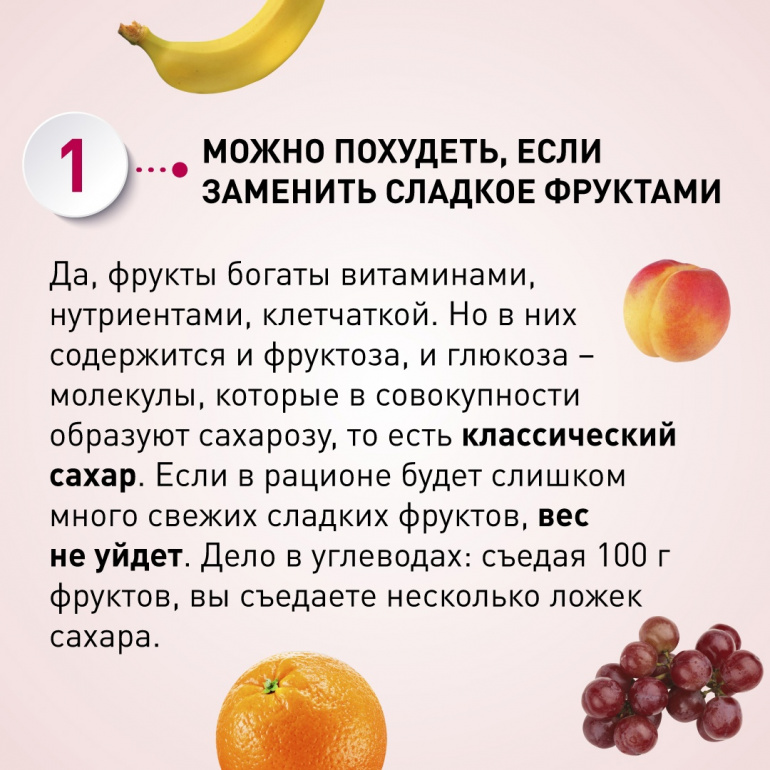 Если стоит задача сократить количество сахара, то стоит знать: фрукты в немалом количестве содержат фруктозу, которая, по сути, тот же сахар.