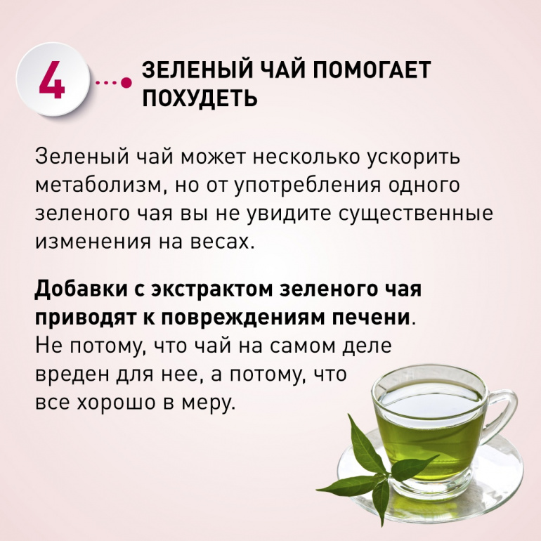 Зелёный чай может еле заметно ускорить метаболизм. А вот если налегать на него не в меру, это создаст опасную нагрузку на печень.
