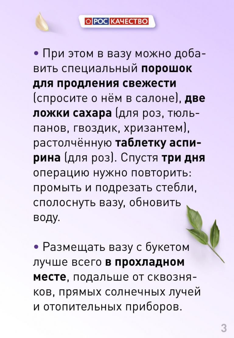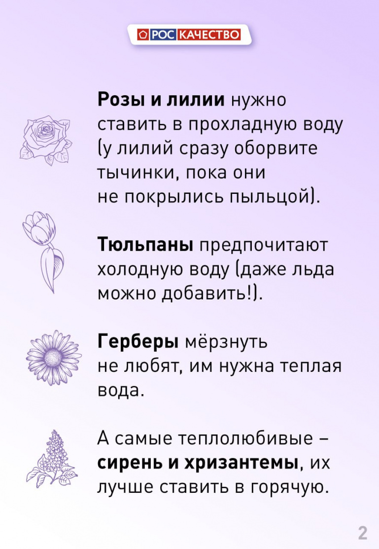 Розы и лилии любят прохладную воду. У лилий, кстати, сразу нужно оборвать тычинки, пока они не покрылись пыльцой. Тюльпаны предпочитают холодную воду, можно даже с льдом. Герберам нужна тёплая вода. А сирень и герберы — мерзляки, их лучше ставить в горячую воду. Также в вазу можно добавить специальный порошок для продления свежести, две ложки сахара (для роз, тюльпанов, гвоздик и хризантем) или растолчённую таблетку аспирина (для роз).