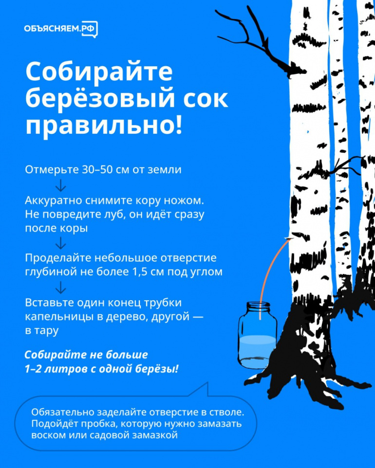 А нельзя собирать сок с молодых деревьев, так как это может привести к гибели растений. Диаметр подходящей берёзы должен быть не менее 25–30 сантиметров на уровне груди взрослого человека.