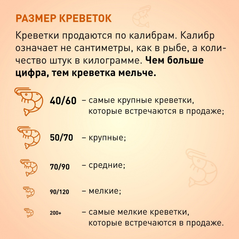 Цифры на упаковке — это калибр креветки, то количество штук в килограмме. Это значит, чем больше калибр, тем креветка меньше.