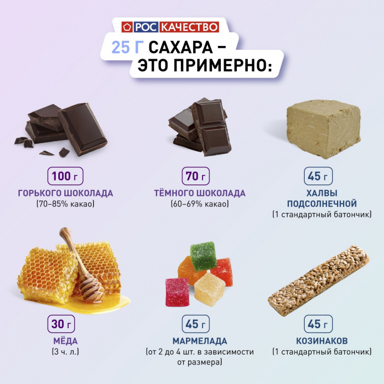 Чтобы было проще понять, как выглядят 25 г сахара в жизни, нутрициолог Василиса Лютая по просьбе Роскачества приготовила инфографику.