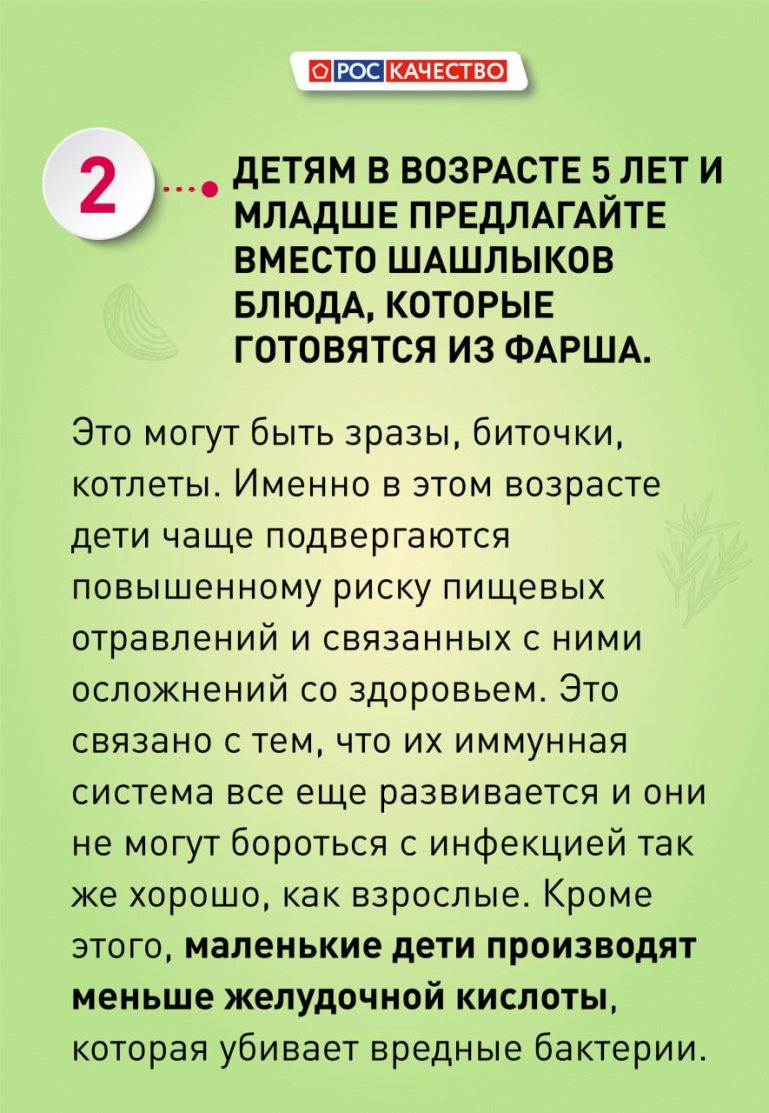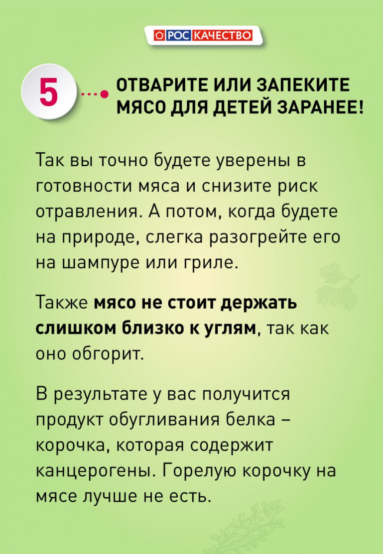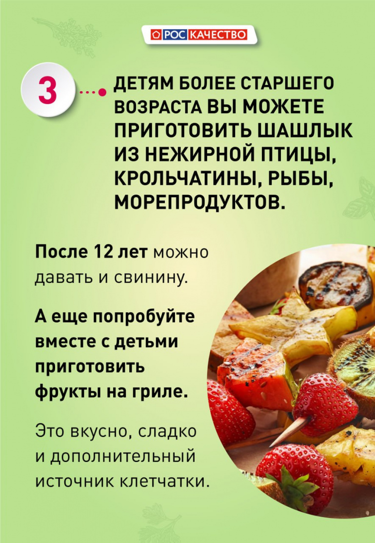 — Если у вашего ребёнка есть проблемы со здоровьем, в частности заболевания желудочно-кишечного тракта, то прежде чем отправляться жарить мясо на природу, следует проконсультироваться с педиатром и гастроэнтерологом, — считает Василиса Лютая.