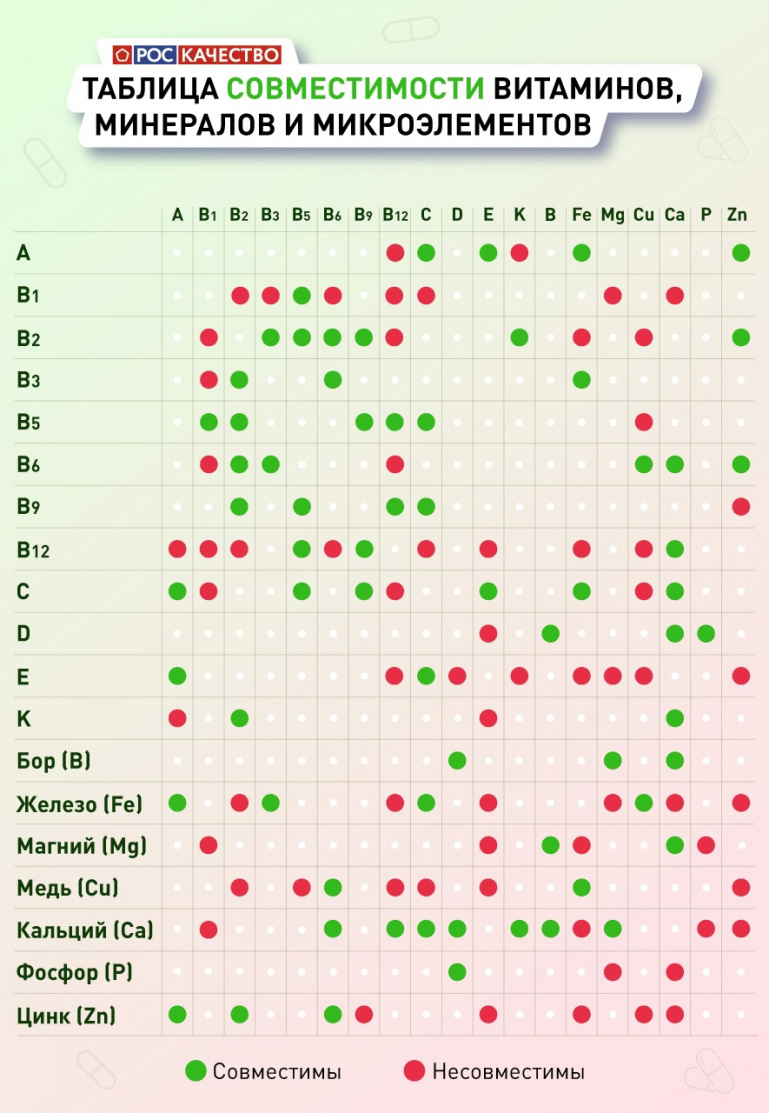 Роскачество подготовило таблицу совместимости витаминов, минералов и микроэлементов