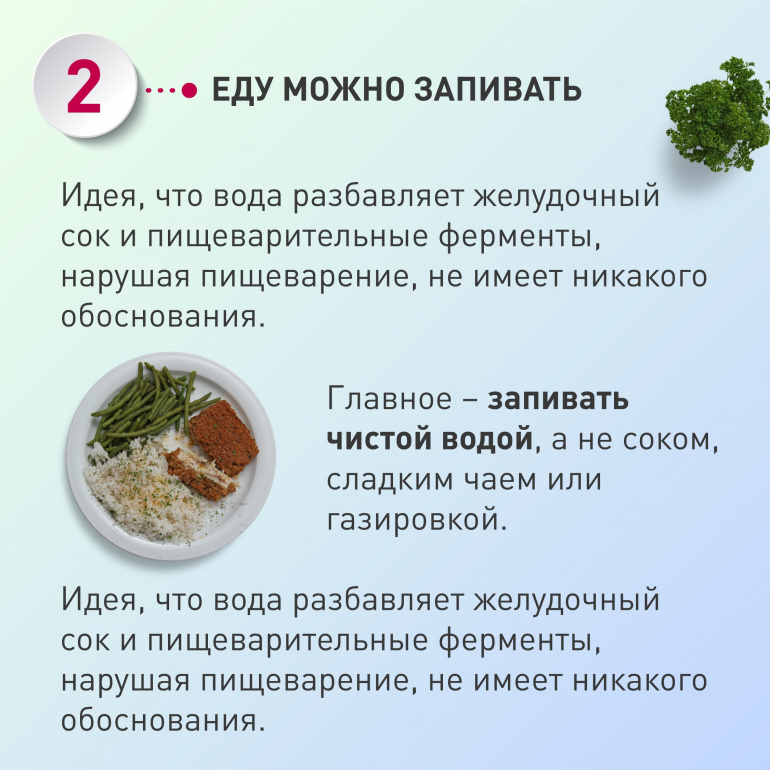 Другой популярный миф гласит, что еду запивать нельзя. Будто бы жидкость разбавляет желудочный сок и мешает пищеварению. В действительности, напитки и правда мешают похудеть, но речь не о воде, а о соках и газировке. И причина в их калорийности, а не во взаимодействии с желудочным соком.