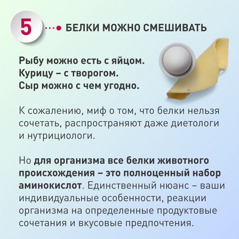 Самый странный миф заключается в том, что разные белки нельзя сочетать. Удивительно, что порой его распространяют даже диетологи. На самом деле для организма все белки природного происхождения — полноценный набор аминокислот.