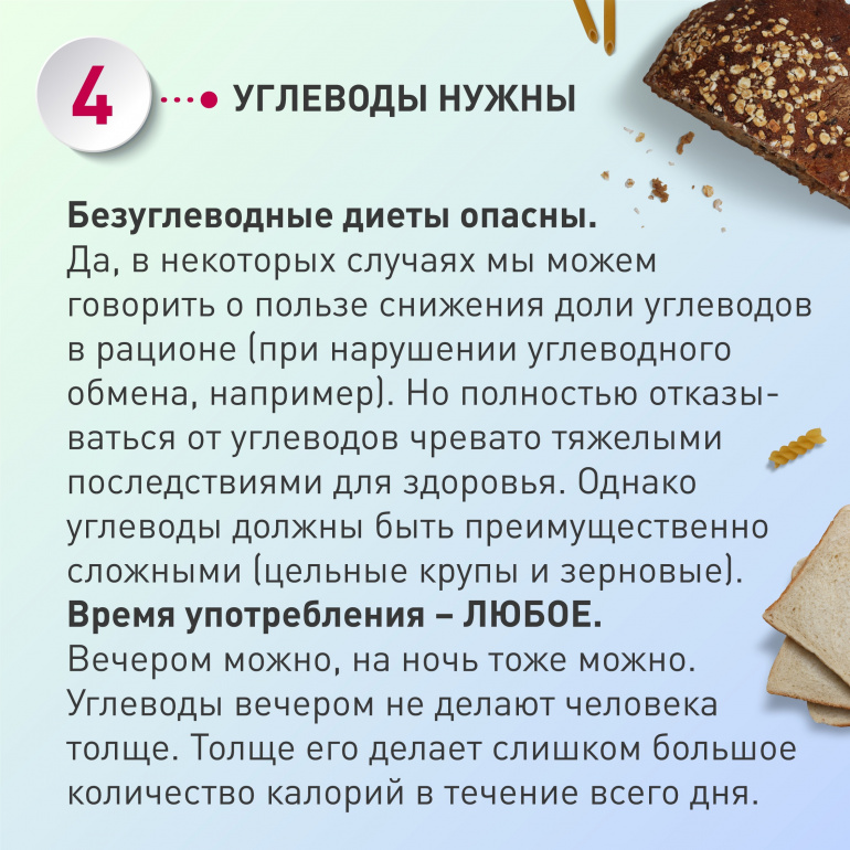Наконец, можно ли употреблять углеводы на ночь? Правильный ответ: любую еду можно в любое время, главное — общее количество калорий и нутриентов за сутки.
