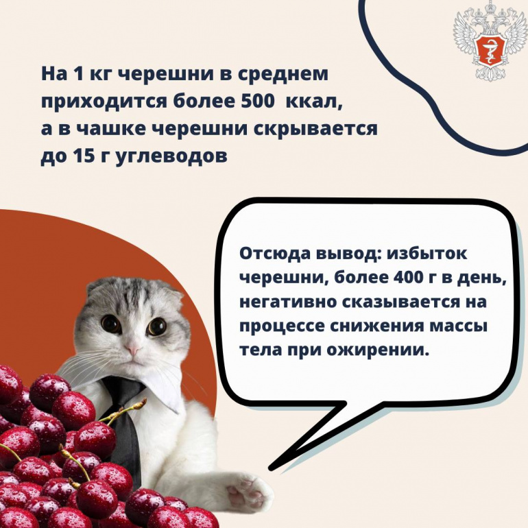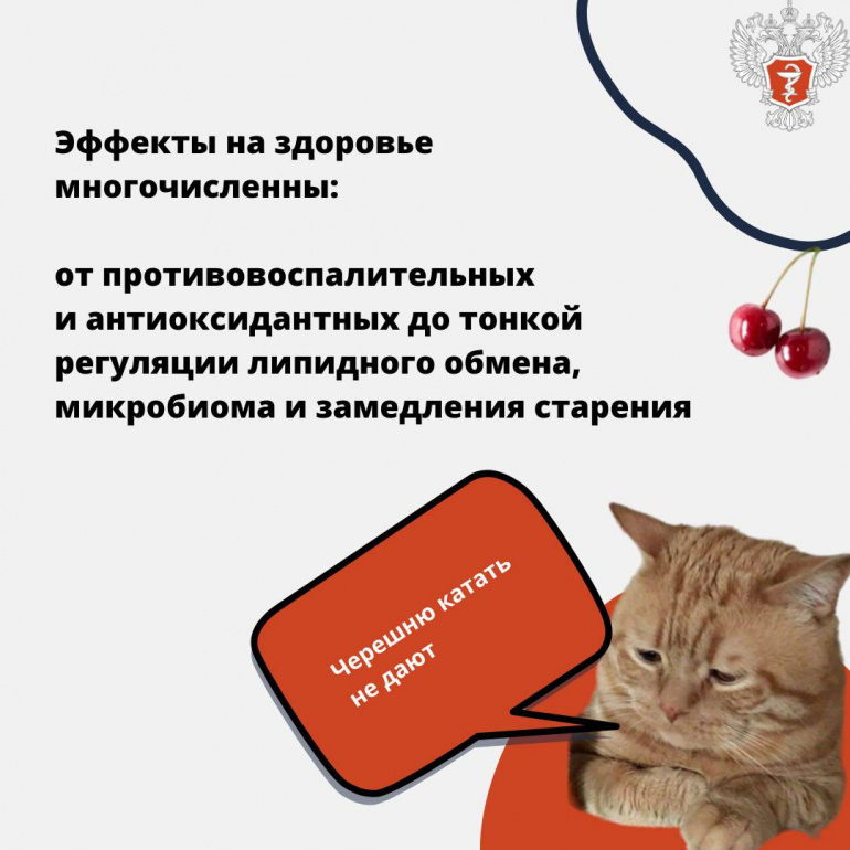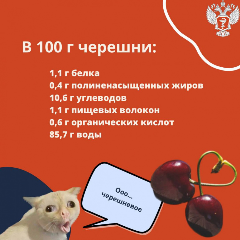Черешня имеет множество полезных эффектов для здоровья. О них Минздрав России подробно рассказывает в карточках.