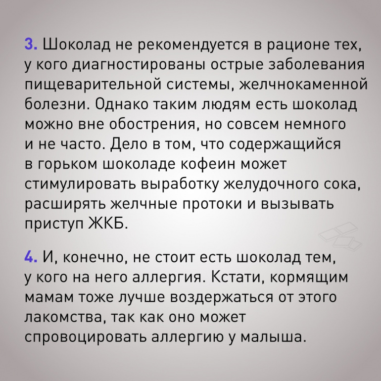 Не «сочетается» горький шоколад и с некоторыми болезнями ЖКТ. Наконец, само собой, горький шоколад запрещён тем, у кого на него аллергия. Не советуют его и кормящим мамам, чтобы не спровоцировать аллергию у малыша.