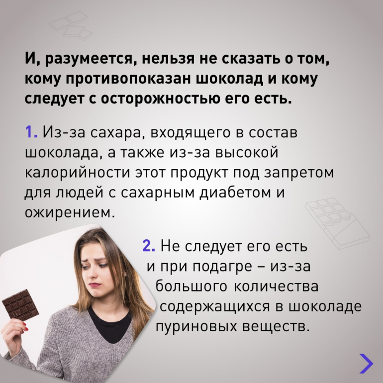 Кому не рекомендован и даже запрещён горький шоколад? При ожирении, к сожалению, этот высококалорийный десерт лучше вообще убрать из рациона. А из-за содержания пурина горький шоколад нельзя есть людям с подагрой.