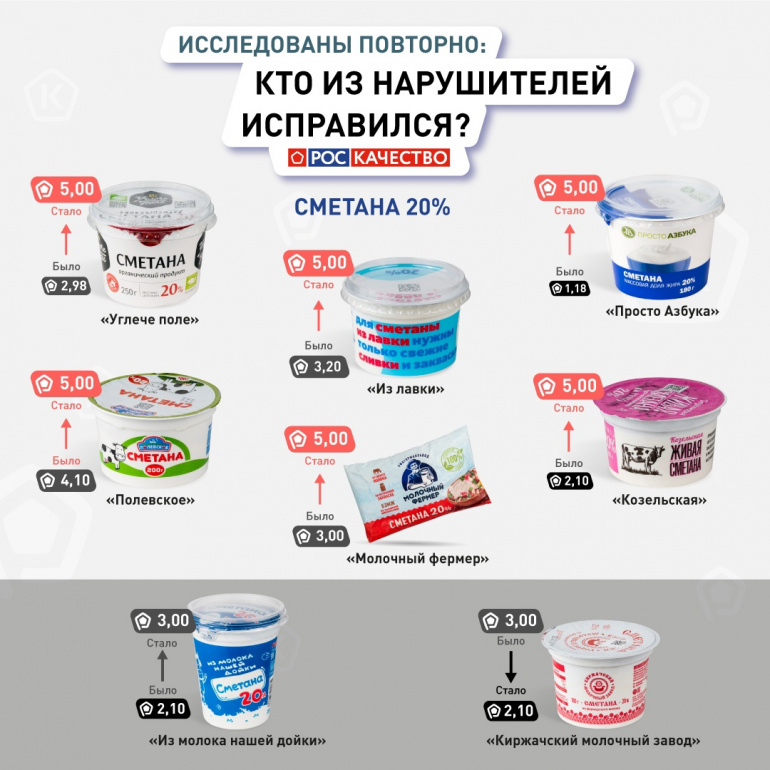 Восемь торговых марок сметаны 20%-й жирности подверглись повторному исследованию. Выяснилось, что за год нарастили качество продукции бренды «Просто Азбука», «Углече Поле», «Из Лавки», «Козельская» (термостатная), «Молочный фермер», «Полевское». Теперь эти товары претендуют на получение Знака качества.