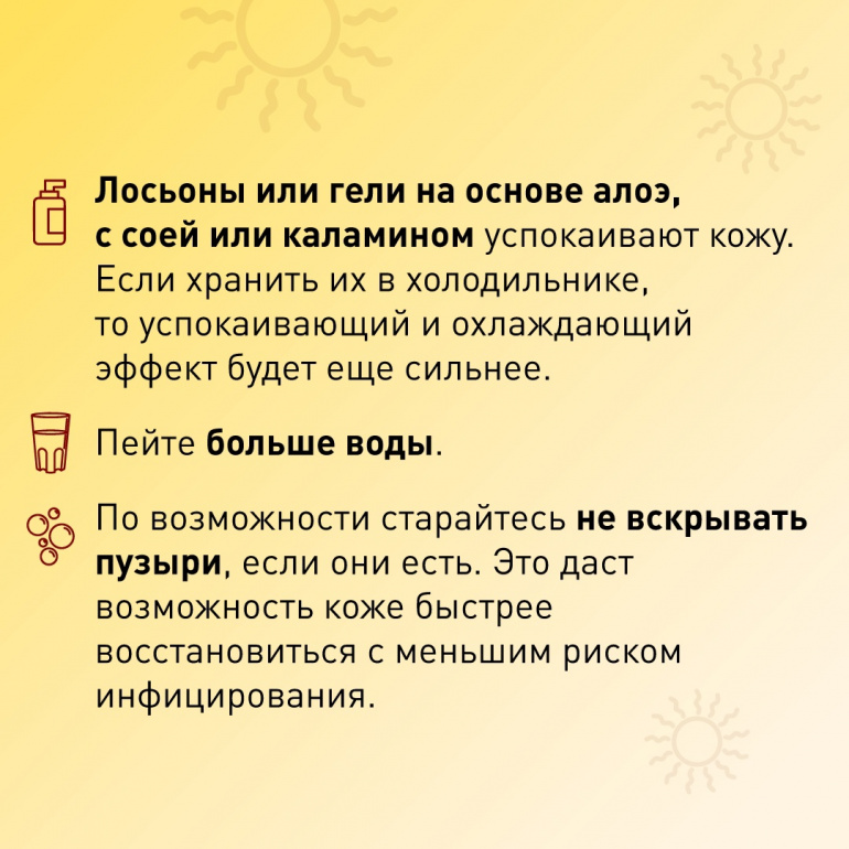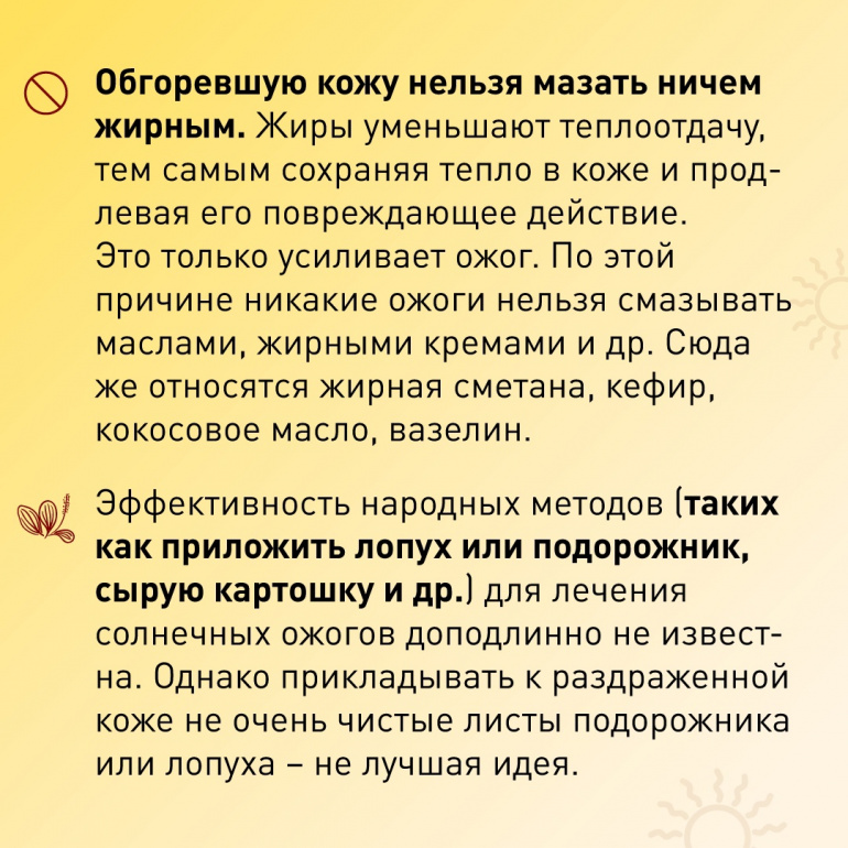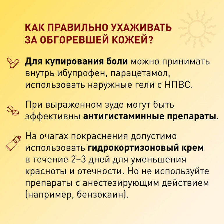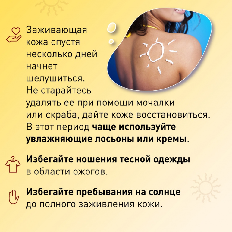 Пока кожа заживает, старайтесь не расчёсывать место ожога. И всё это время под палящее солнце выходить не нужно.