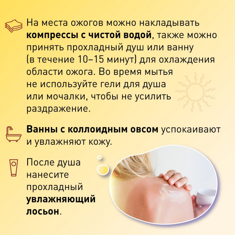 Но порой солнечный ожог застаёт вдали от полноценной аптечки. Тогда можно просто принять прохладный душ, ванну или просто облиться водой. Как вариант, можно наложить компресс с прохладной водой. А после душа смазать кожу увлажняющим лосьоном. Так или иначе, стоит также пить больше воды.