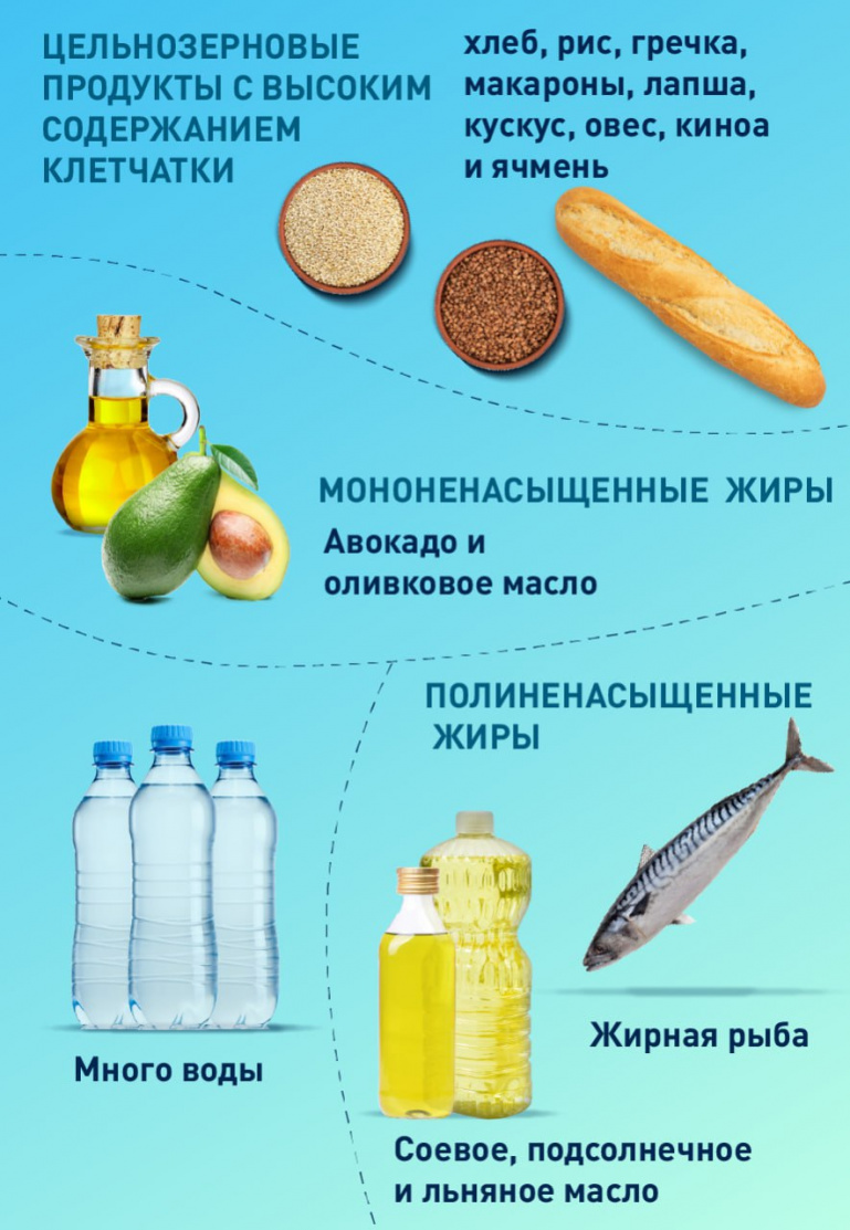Это необходимо для того чтобы снизить уровень холестерина в крови, очистить сосуды от атеросклеротических бляшек и восстановить нормальный ток крови в артериях. Вместо животных жиров следует потреблять растительные, например — подсолнечное, льняное, оливковое, рапсовое масло, но не более 70 г в день. Полностью исключить из рациона простые углеводы и потреблять сложные — около 350–400 г в день.