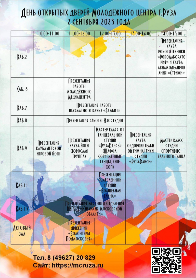 В День открытых дверей посетителям расскажут о работе центра, студиях и кружках на любой вкус, например «Йога для всех», «Изостудия», «Шахматы», «Авиамоделирование», «Роболаборатория», «Волшебная глина», « Спортивно-бальные танцы», «RuzaDance», «Наука рядом» и многих других. Также детей познакомят с движениями «Волонтёры Подмосковья», «Юнармия» и «Молодёжный медиацентр».