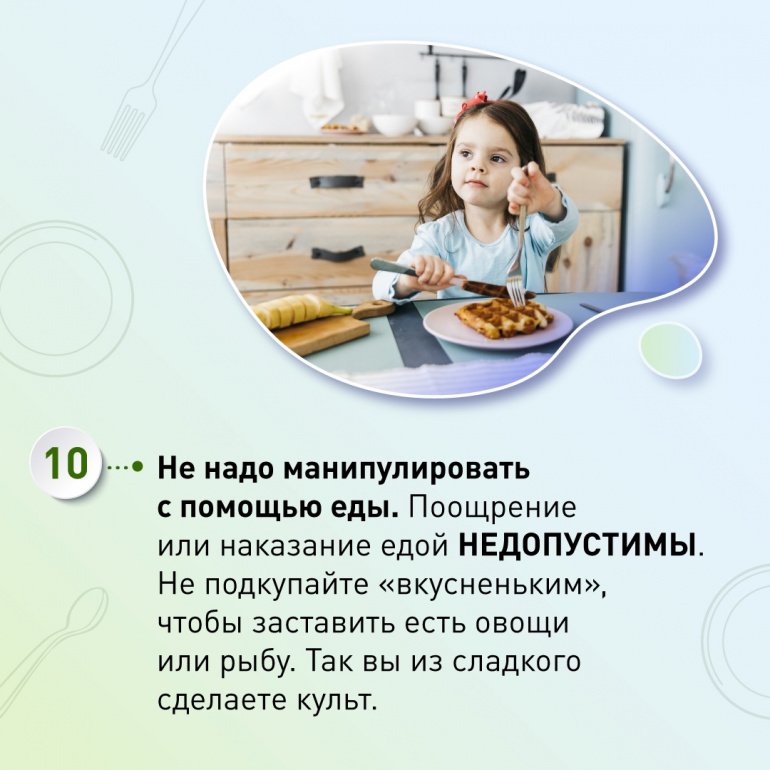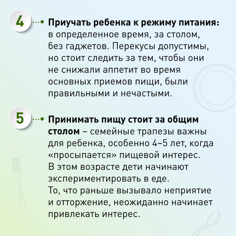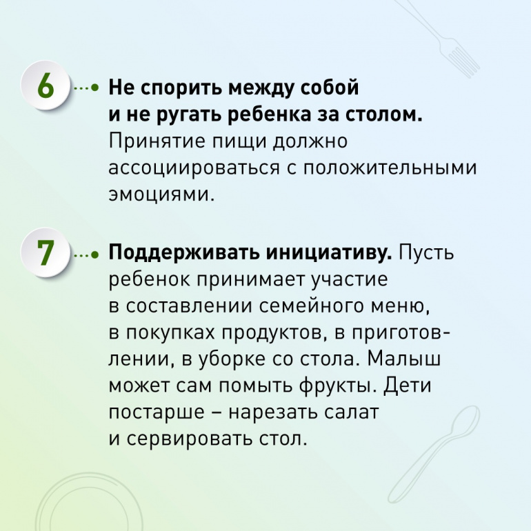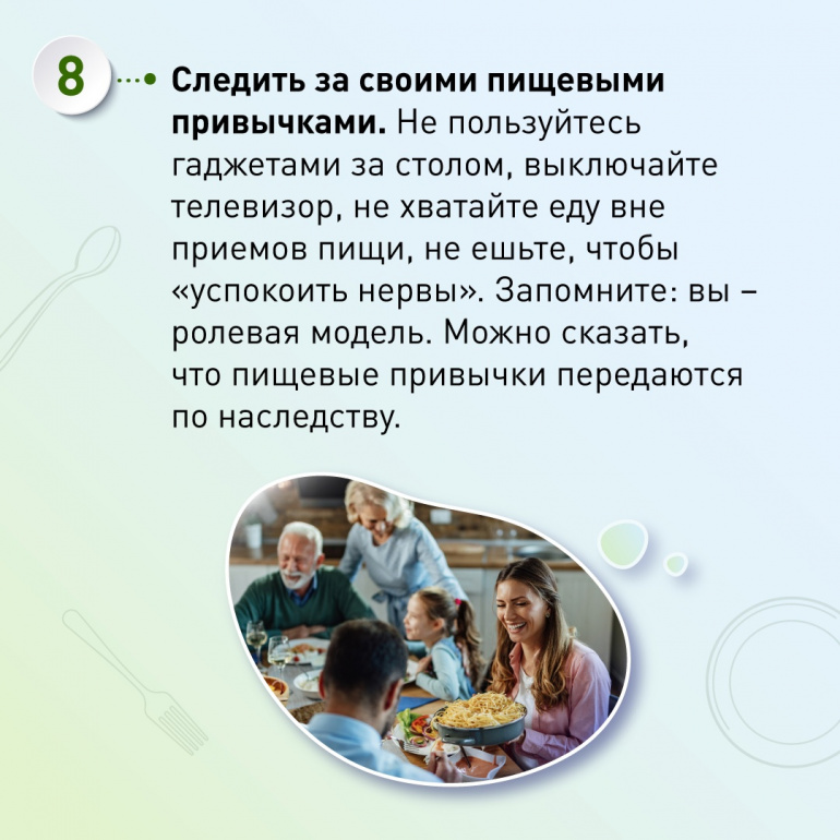 Ребёнок перенимает не только то, что родители едят, но и то, как они это делают. Не хотите, чтобы ребенок ел исключительно под телевизор — не подавайте такого примера.
