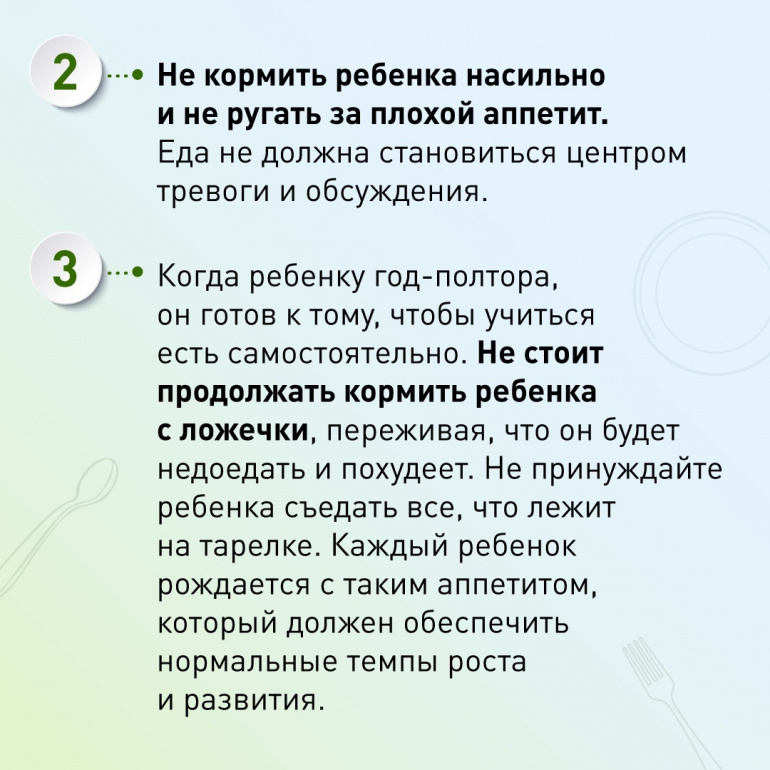 Кормить насильно не нужно, иначе еда будет ассоциироваться у ребёнка с руганью и скандалами.