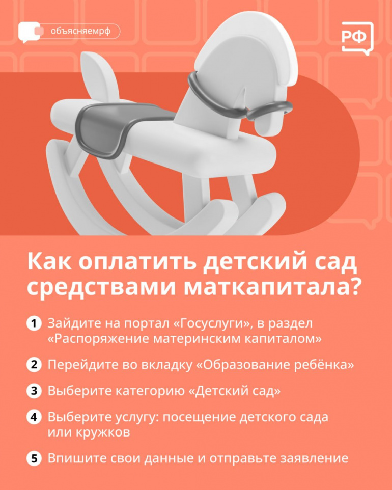 Быстро и просто оформить оплату детсада маткапиталом можно: на портале «Госуслуги», в многофункциональных центрах, а также в клиентской службе Социального фонда.