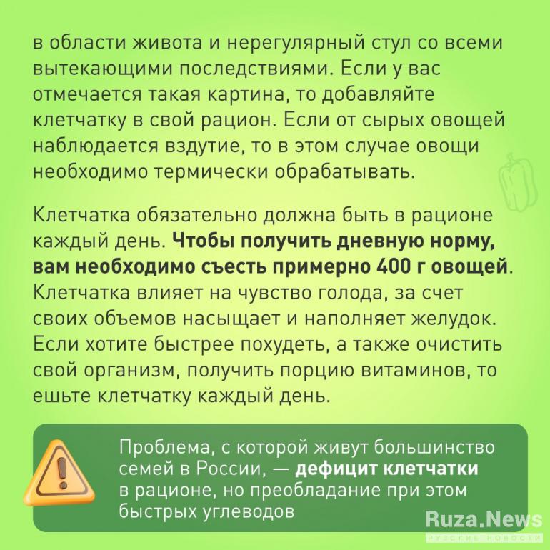 Достаточное количество клетчатки содержат 400 г овощей, фруктов и ягод — это норма на день. Добирают этот объём далеко не все — большинство людей как в России, как и во всём мире живут с дефицитом клетчатки, переедая при этом быстрых углеводов.