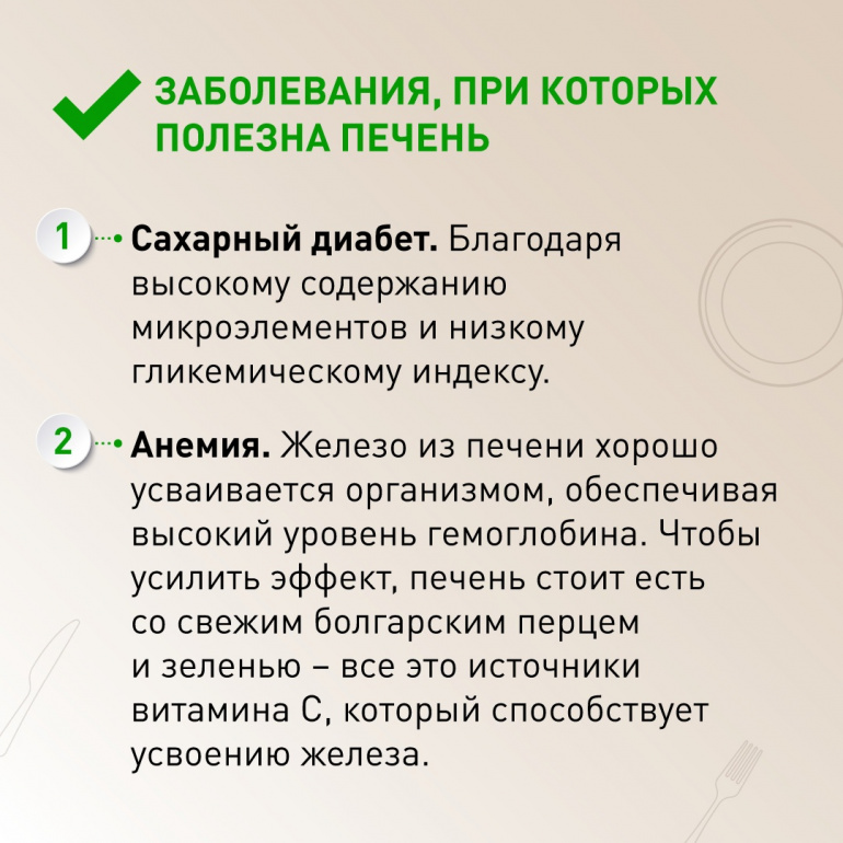 Говяжья печень на обеденном столе станет прекрасным дополнением терапии при сахарном диабете, а также при анемии. А чтобы железо из печени лучше усваивалось, употребляйте её с источниками витамина С, например, болгарским перцем и зеленью.