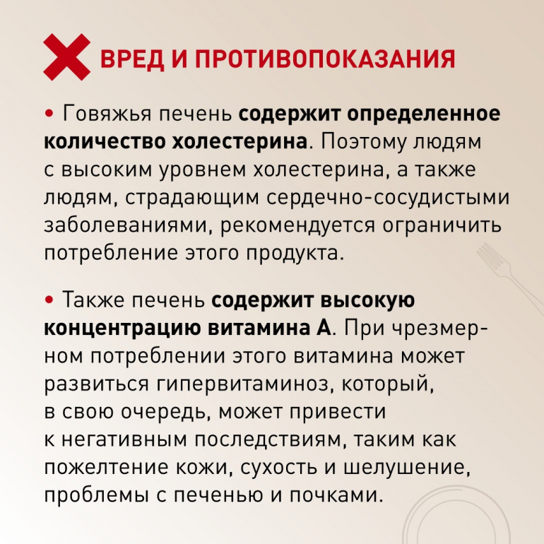 Как и большинство продуктов, печень хороша, если есть её в меру. В противном случае можно перебрать холестерина и даже заполучить гипервитаминоз.