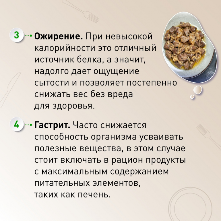 Также печень рекомендуют при гастрите и ожирении. В ней немного калорий, но много белка, а значит, она отлично насыщает.
