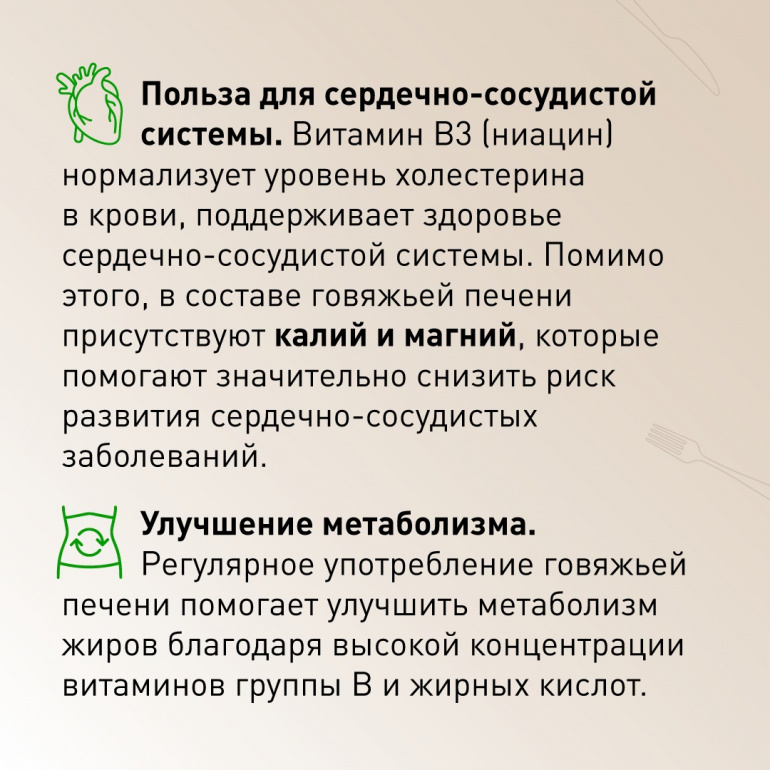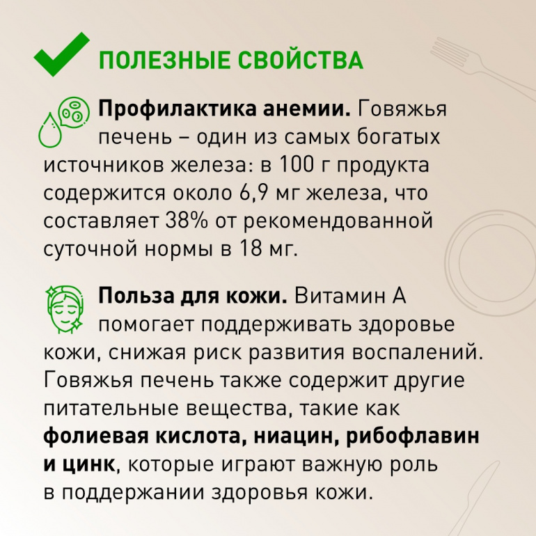 Пожалуй, ключевая ценность говяжьей печени заключается в том, что она — один из самых богатых источников железа. Всего 100 г печени более чем на треть компенсируют потребность организма в этом микроэлементе.