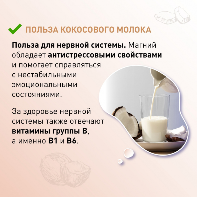 Кокосовое молоко помогает справиться со стрессом и богато витаминами группы В.