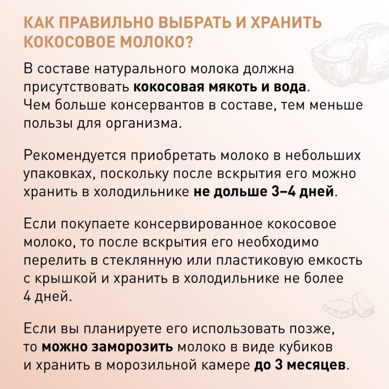 После вскрытия упаковку кокосового молока лучше не хранить в холодильнике дольше 3–4 дней. Если не успеваете выпить напиток за это время, заморозьте его кубиками как обычный лёд и размораживайте по необходимости.