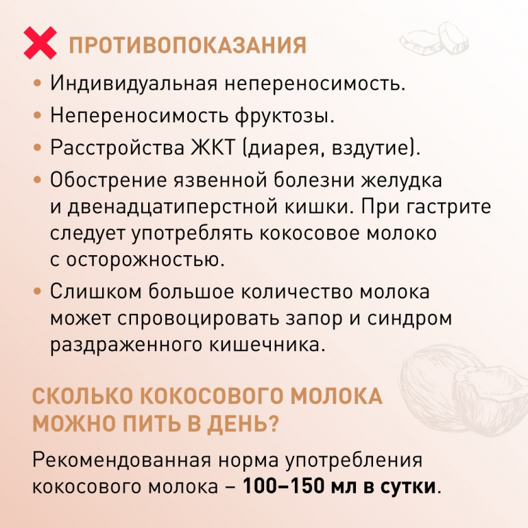 Кокосовое молоко не стоит пить тем, кто страдает болезнями ЖКТ. Но даже здоровым людям лучше не превышать норму в 100–150 мл в сутки.