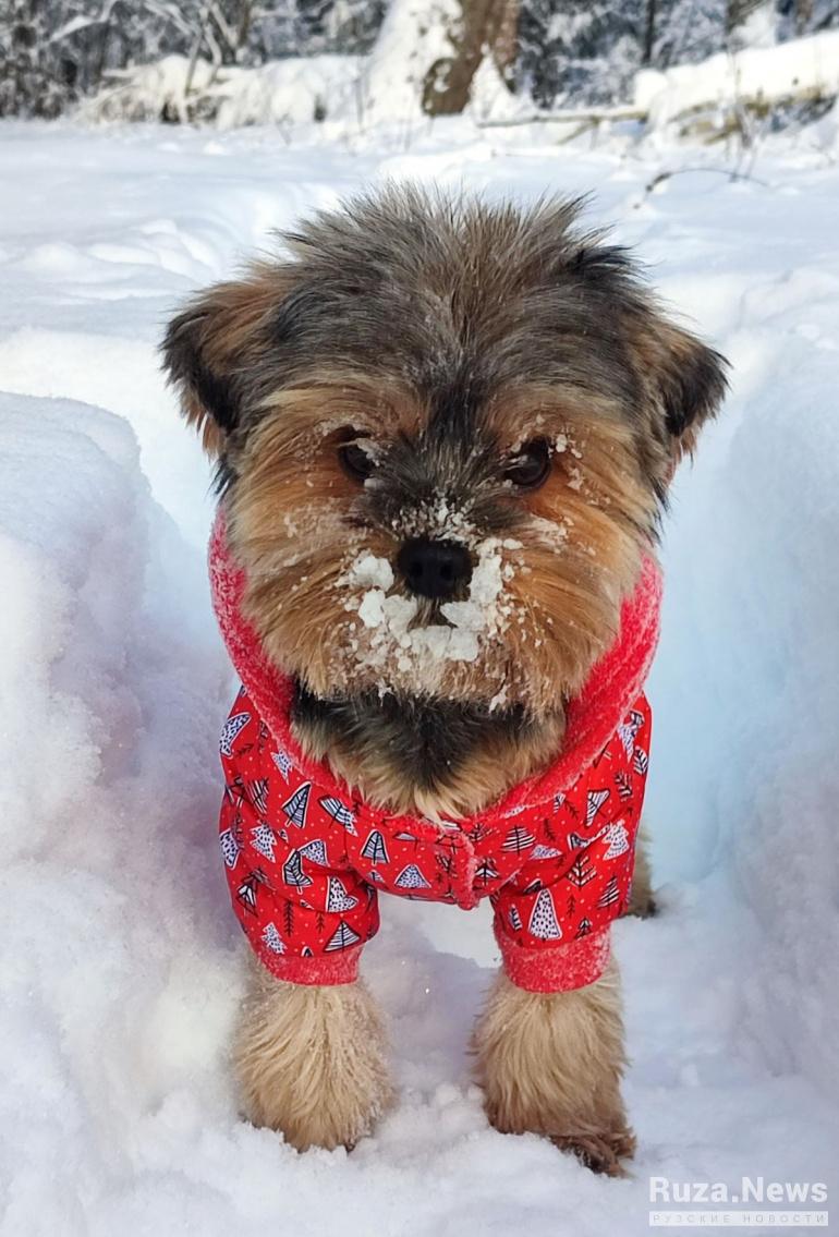 Четвероногие друзья тем более не сидели в праздники дома, а, надев тёплые курточки, наслаждались пушистым снегом
