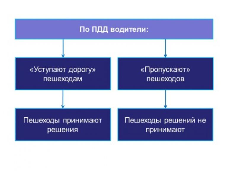 Как видим, по ПДД водители, или «пропускают» пешеходов, или «уступают дорогу» пешеходам. И разница огромна.