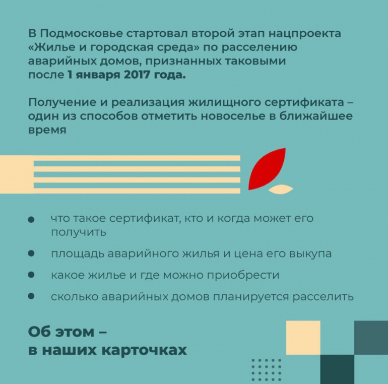 — Речь идёт о жилищном сертификате, который является альтернативой прежней форме расселения, — рассказал Николай Пархоменко. — Утраченные квадратные метры государство готово компенсировать, предоставив денежную субсидию собственникам. Каждый собственник аварийного дома получит 130 тысяч рублей за квадратный метр. Для собственников Рузского городского округа, которые до сих пор живут в аварийном доме, это возможность получить новое жильё.