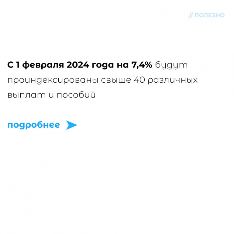 — По поручению президента Владимира Путина с 1 февраля 2024 года на 7,4% проиндексированы свыше 40 различных выплат и пособий, — сообщили в пресс-службе Мособлдумы. — Такая мера коснулась более 20 миллионов человек, из которых свыше 500 тысяч — жители Московской области.