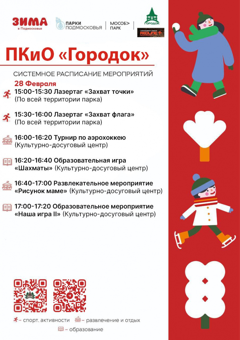 Насыщенная программа пройдёт в парке «Городок» в среду, 28 февраля. Все желающие смогут сыграть в подвижные игры, сразиться в турнире по аэрохоккею, сыграть в шахматы, принять участие в мероприятиях «Рисунок маме» и «Наша игра II».