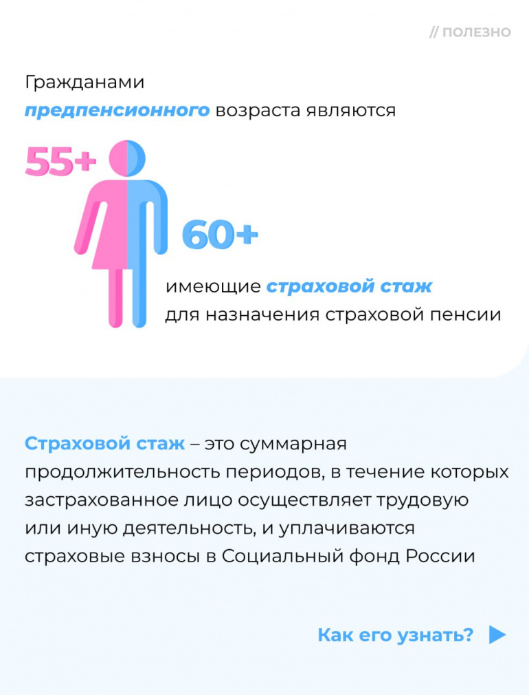 Людьми предпенсионного возраста считаются те, кто имеет страховой стаж для назначения страховой пенсии. Узнать страховой стаж можно, заказав выписку из лицевого счёта через портал «Госуслуги» или сайт Социального фонда России.