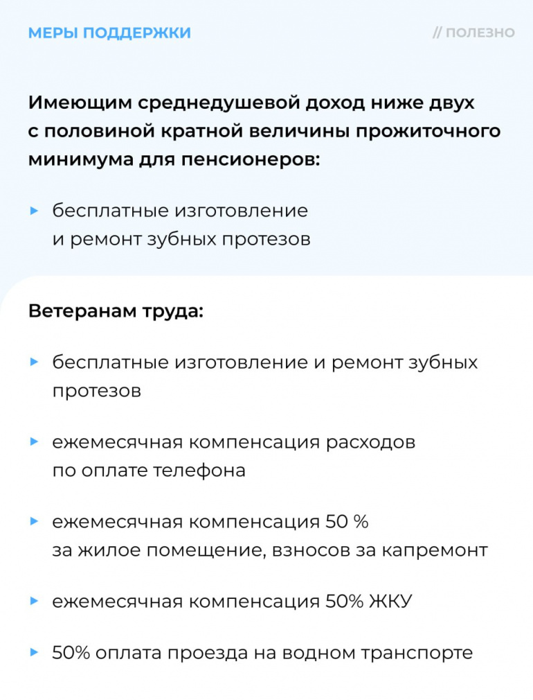Пенсионерам, имеющим среднедушевой доход ниже двух с половиной кратной величины прожиточного минимума, доступны бесплатное изготовление и ремонт зубных протезов. Ветераны труда могут получить ежемесячную компенсацию расходов по оплате телефона, 50% возврат денег за жилое помещение и взнос капремонта, а также 50% оплаты проезда на водном транспорте.