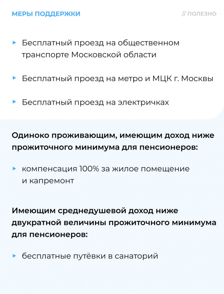 Ружане предпенсионного возраста могут рассчитывать на бесплатный проезд на общественном транспорте Московской области, 100% компенсацию за жилое помещения и капремонт, бесплатные путёвки в санатории.
