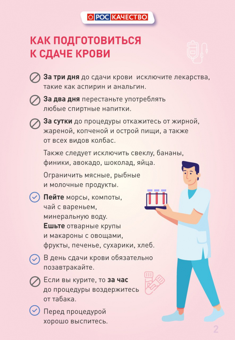 Важно за три дня до процедуры исключить употребление аспирина и анальгина, а за два дня — отказаться от алкоголя, а за день — убрать из рациона жирную, жареную, копчёную и острую еду. В список «запрещёнки» также входят: свёкла, бананы, финики, авокадо, шоколад, яйца, мясные, рыбные и молочные продукты. Нужно есть больше макарон, овощей, фруктов, пить морсы, компоты или чай с вареньем. Перед сдачей крови лучше хорошо поспать и позавтракать.