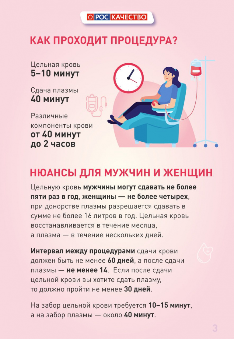 Процедура сдачи цельной крови занимает 5–10 минут, сдача плазмы — 40 минут, а различных компонентов крови — от 40 минут до двух часов. Важно отметить, что интервал между процедурами должен быть не менее 60-ти дней, а после сдачи плазмы — не менее 14-ти.