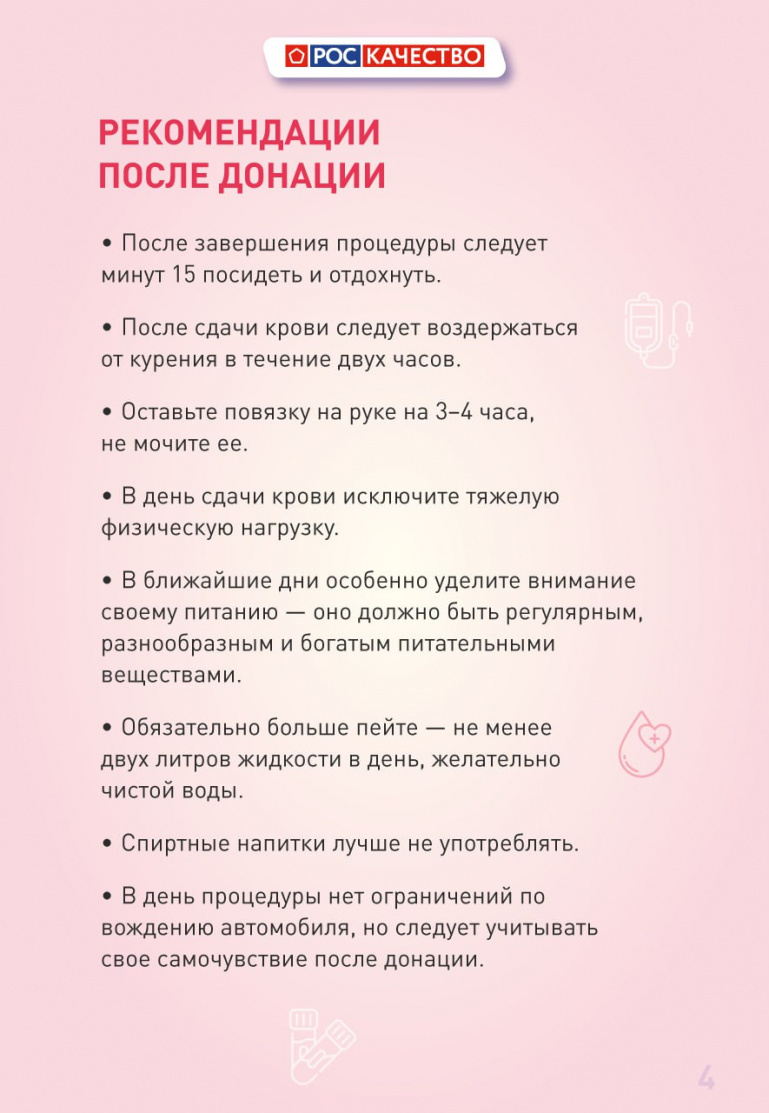 Сдав кровь, необходимо минут 15 посидеть и отдохнуть. В день процедуры хорошо питайтесь, больше пейте, исключите физические нагрузки, алкоголь и сигареты.