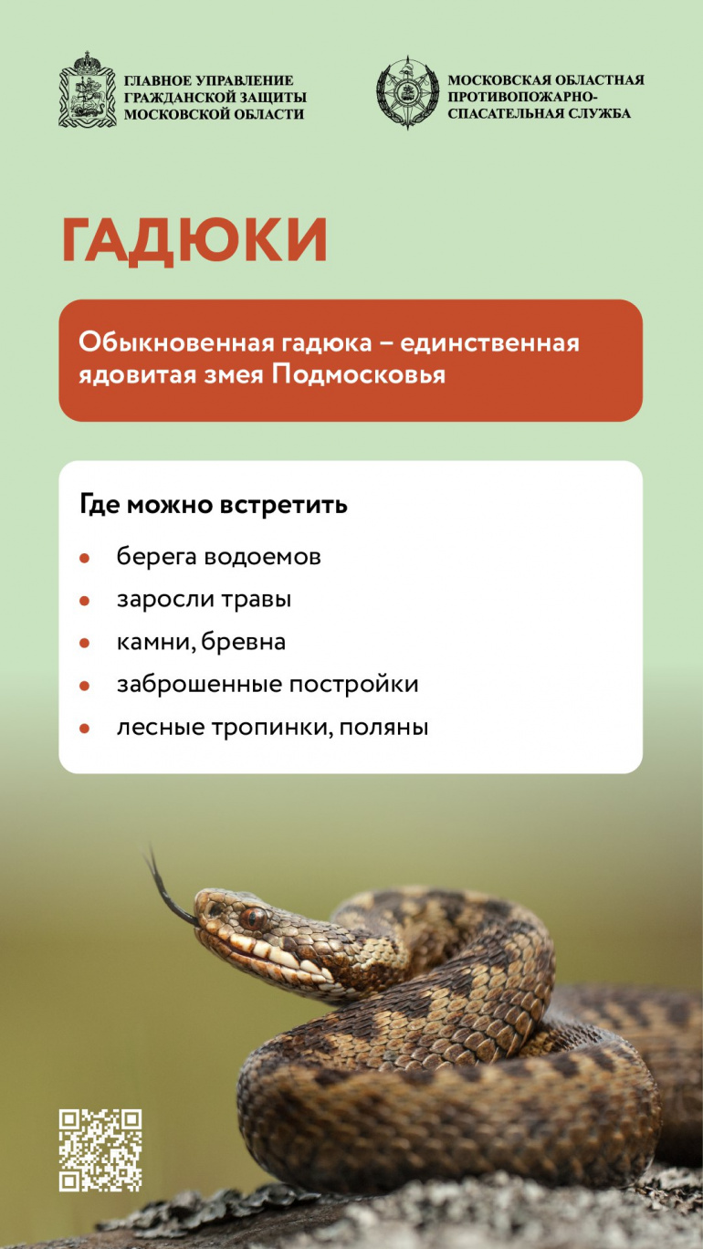 Гадюки — это единственные ядовитые змеи, которые обитают в Подмосковье. Как правило, их можно встретить вблизи водоёмов, заброшенных построек, лесных тропинок, а также на камнях, брёвнах и в зарослях травы.