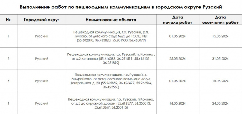 Новые объекты появятся в рамках программы «Пешком». В мае и июне запланировано обустройство дорожки в посёлке Тучково, от детского сада № 25 до школы № 1 имени А. А. Мезенцева. Ещё две дорожки сделают в посёлке Кожино на пути от дома № 2 до аптеки, а также от дома № 3 до окружной дороги. В деревне Андрейково тропинка появится от остановки до дома № 20 на улице Центральной.