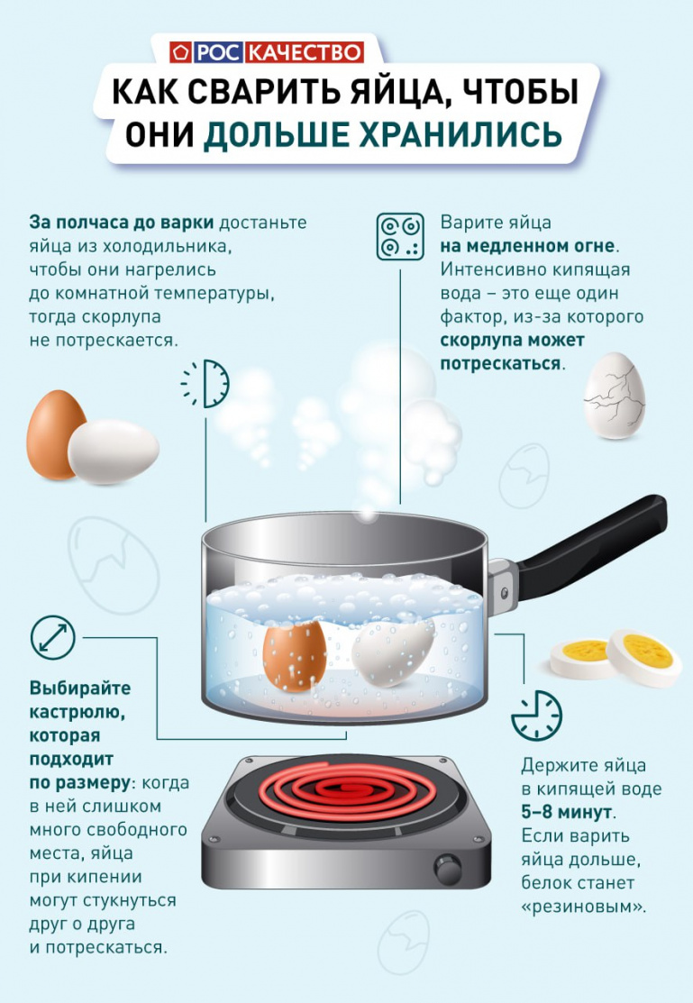 Чтобы яйца хранились как можно дольше, важно, чтобы скорлупа не потрескалась при варке. А для этого за 30 минут до термической обработки их нужно оставить при комнатной температуре. Для варки важно выбрать кастрюлю по размеру и готовить яйца на медленном огне: так оболочка останется целой. А чтобы желток не стал «резиновым», в кипящей воде яйцам лучше находиться до 5–8 минут, не больше.